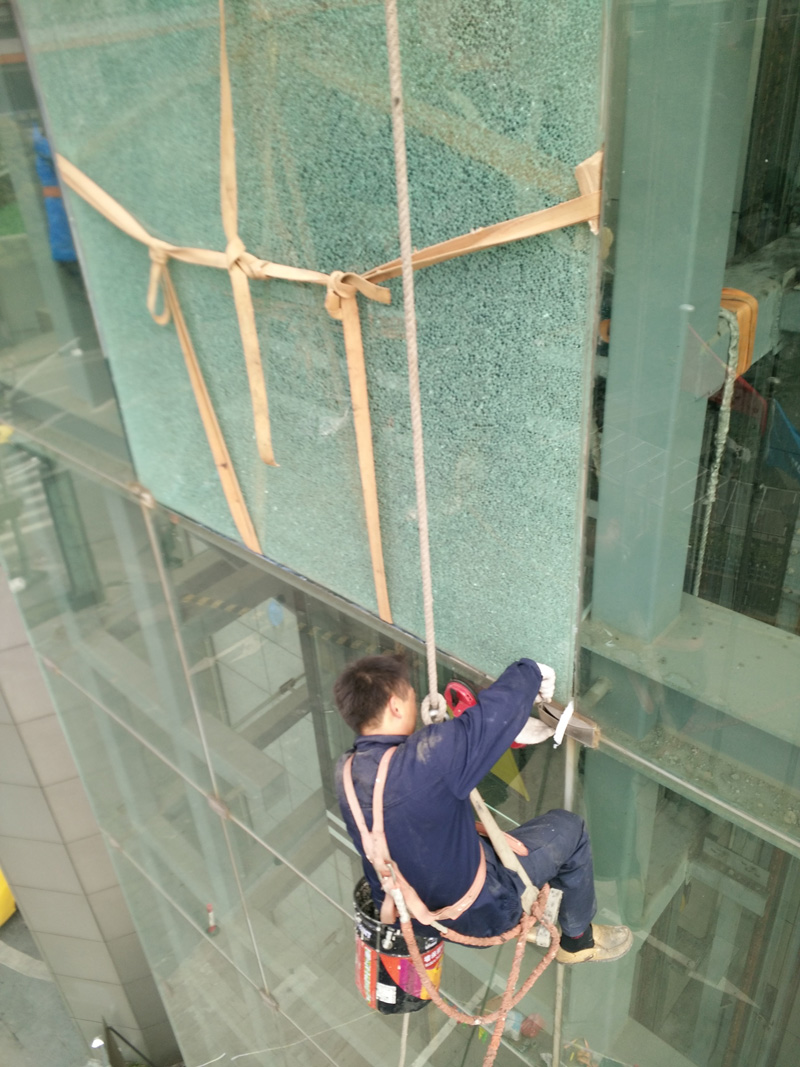 在施工期間的保護。在施工中通常是用鮮艷的小旗、彩飾帶子等懸掛在玻璃附近或貼附在窗框前方、側(cè)柱或窗臺上以標記出這是安裝玻璃的空間。決不要讓繩索直接觸到玻璃,并且也不要讓記號或涂料直接畫在玻璃表面上,如果焊接、切割噴沙或者其他可能損傷玻璃的建筑工藝在接近玻璃的地方采用,則必須應用膠合板或塑料板作為一層嚴密的隔離層板以防止它們影響以至損壞玻璃。